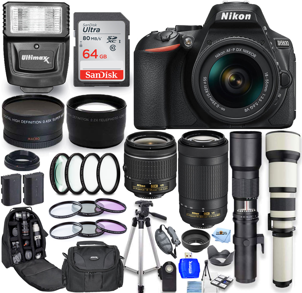 Nikon D5600 Camera with 18-55mm + 70-300mm VR + 500mm + 650-1300mm 64GB Bundle