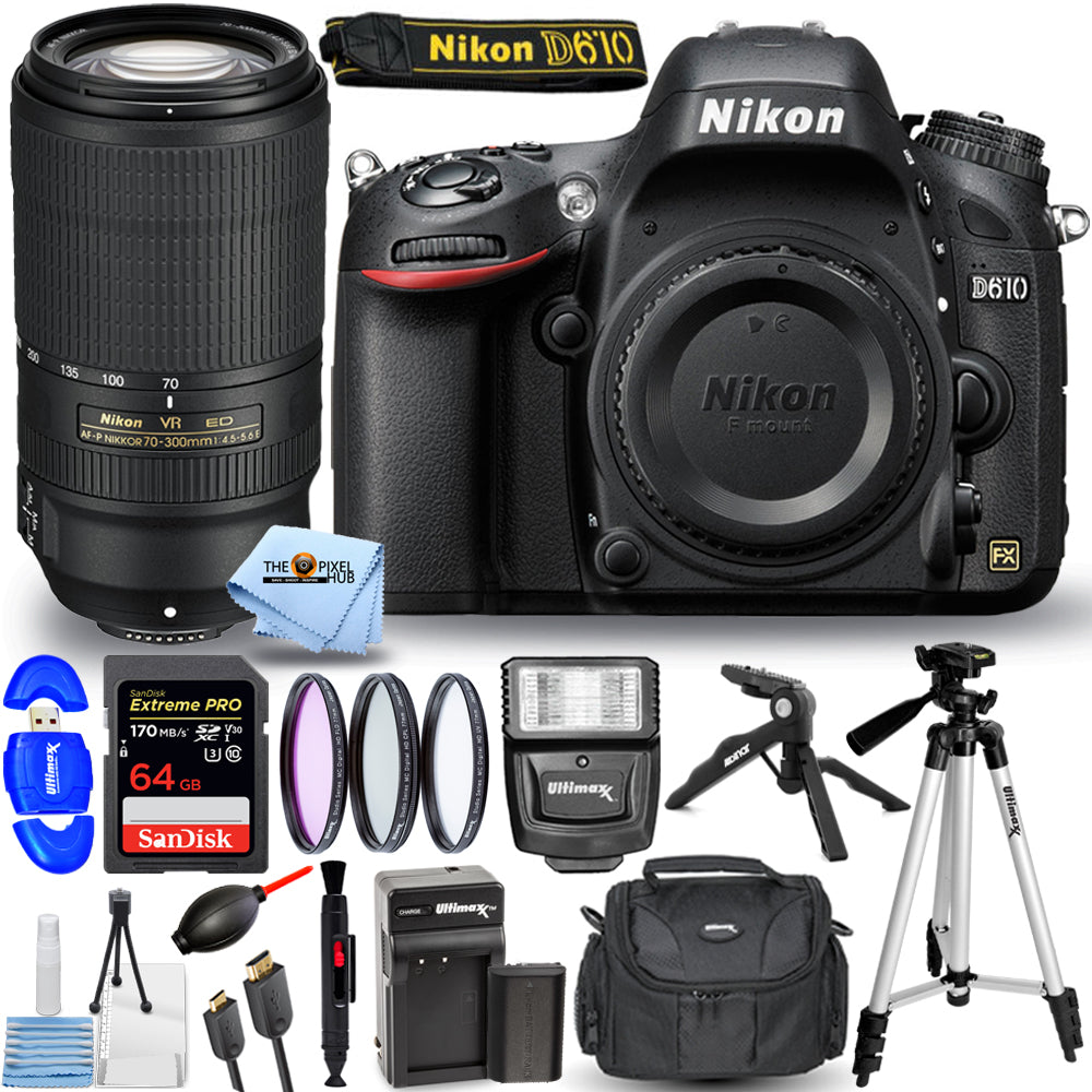 Nikon D610 Camera with 70-300mm f/4.5-5.6E ED VR Lens + EXT BATT + 64GB Bundle