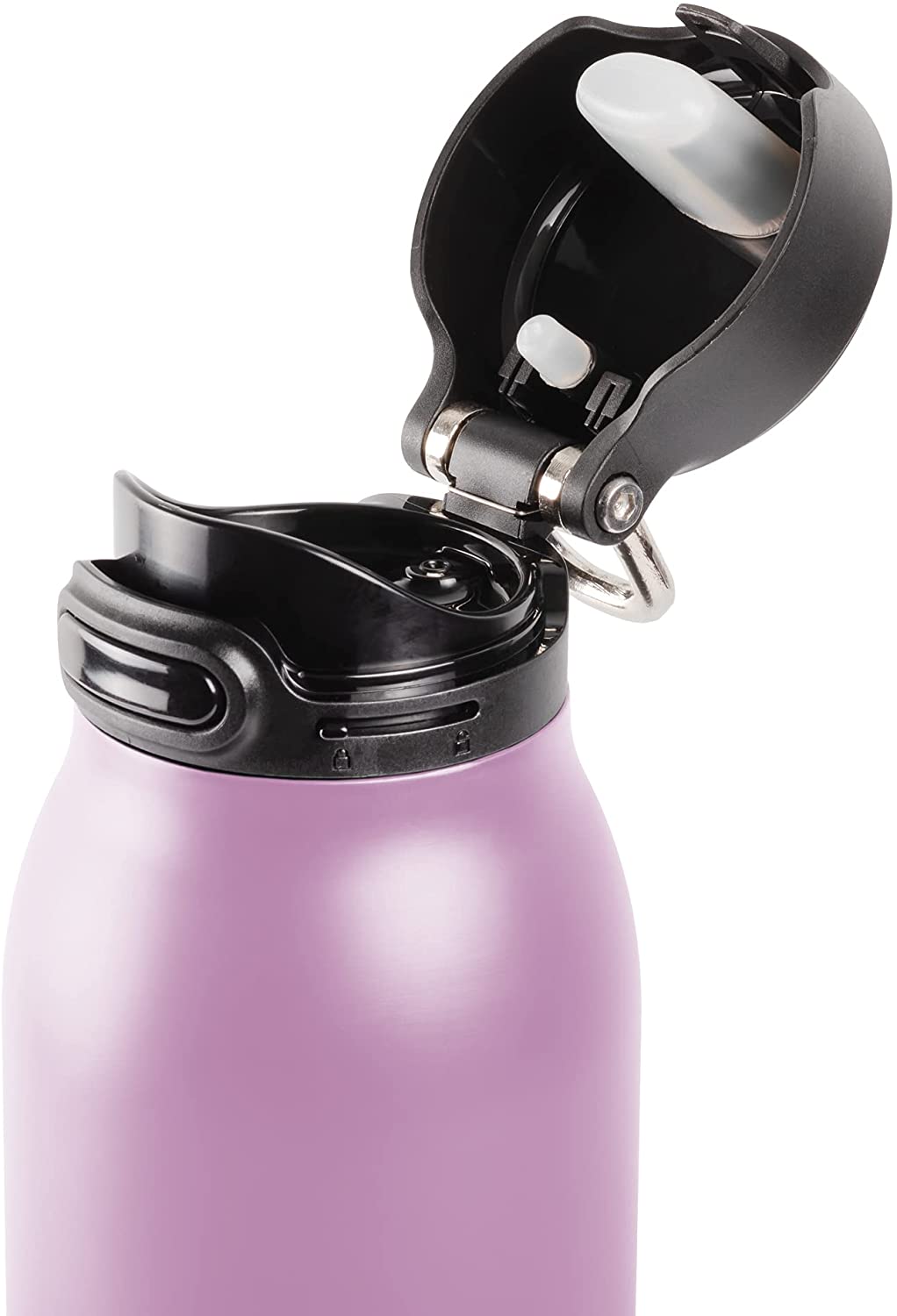 Convenient flip top with drinking spout + removable cap with attached carry loop.